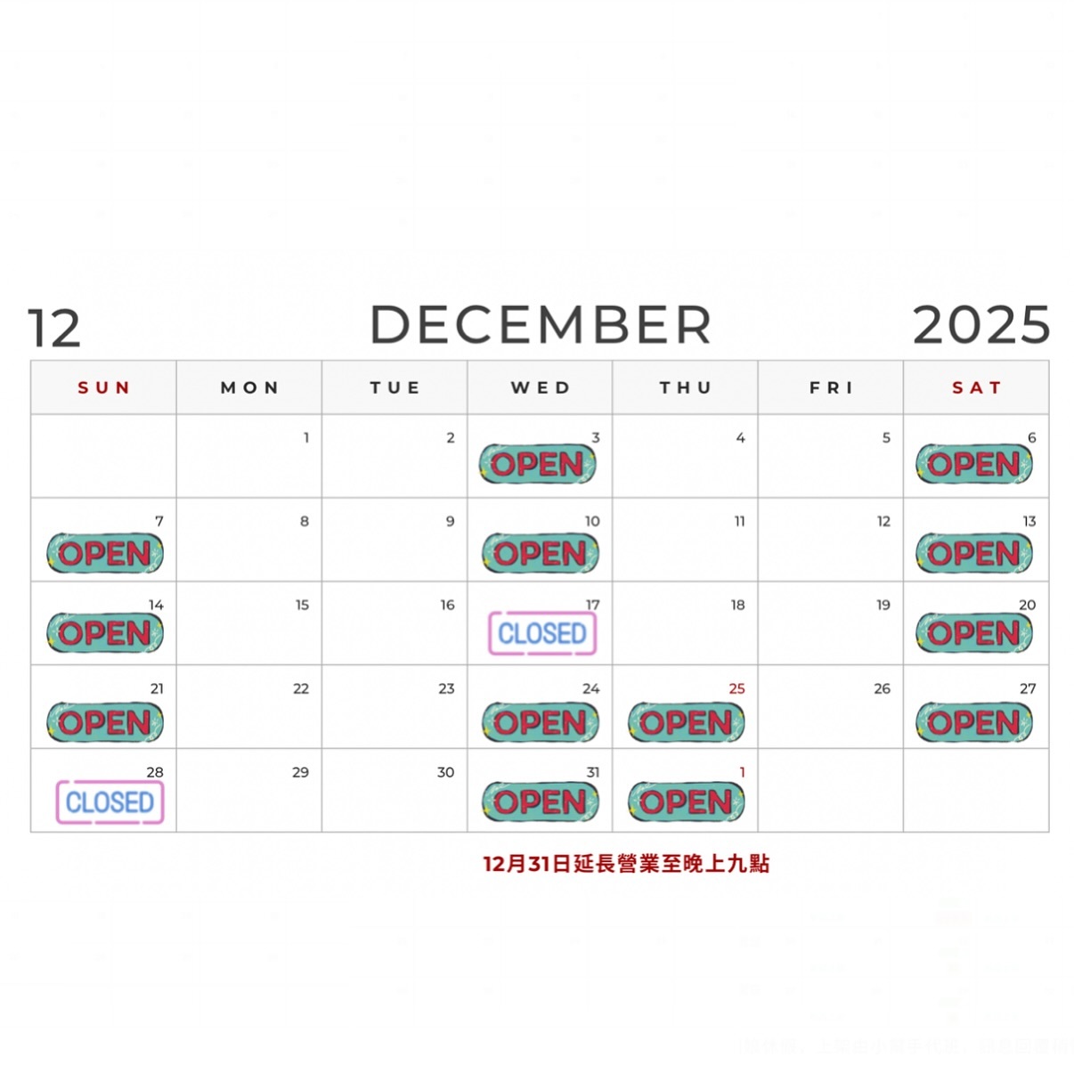 *12/31(三)延長營業至晚上9:00